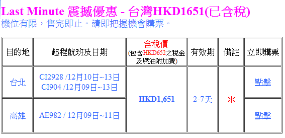 中華航空今日推出左個Last Minute 震撼優惠,香港往返台北、高雄$1641(已包稅)
