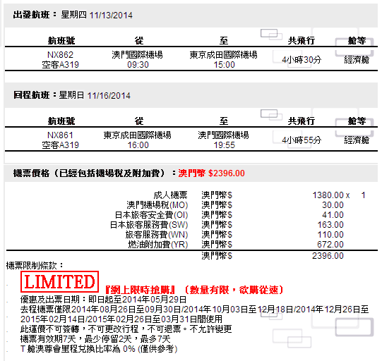 我們以澳門飛東京11月13日去,11月16日返為例
