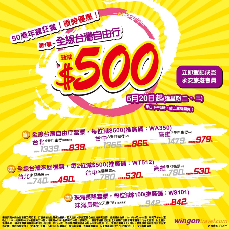 全線台灣自由行套票每位減$500,推廣碼:WA350 (每日名額35個,額滿即止)