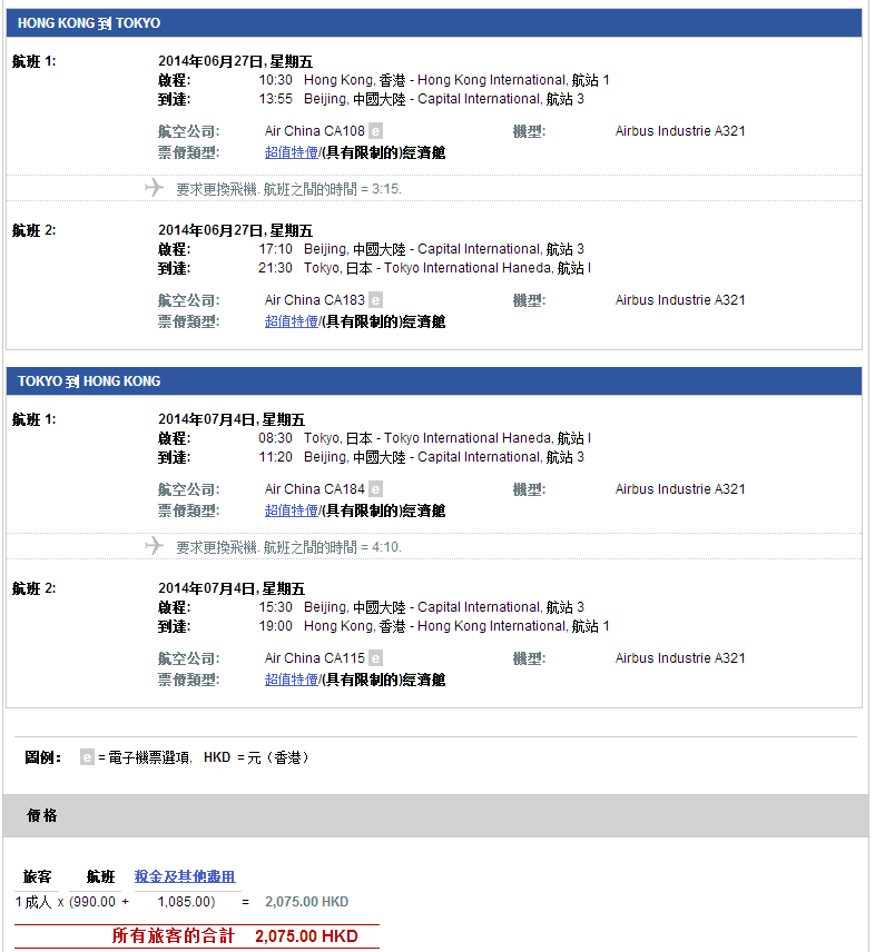 機票只需$990 + $1,085 (稅) = 機票連稅$2,075