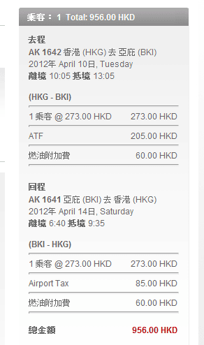 香港往返沙巴(亞庇)來回連稅只需$956 (去程連稅$538,回程連稅$418)