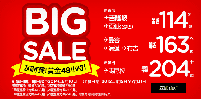 開搶啦!亞航Big Sale!香港飛吉隆坡來回連稅$726,沙巴$798,清邁$826,曼谷$866,布吉$1,146 – AirAsia (優惠延長至6月10日)