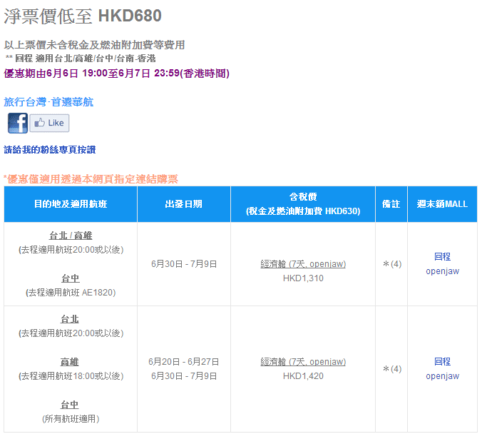 優惠可以open jaw,回程可以改由台北/高雄/台中/台南返香港