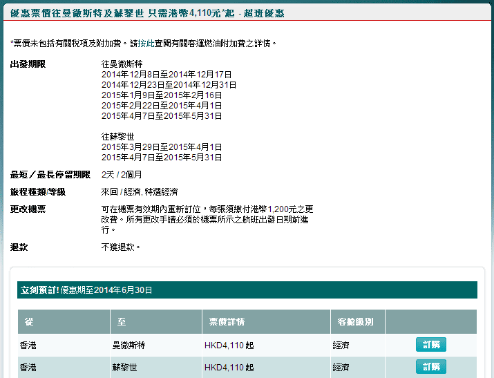 當中曼徹斯特出發日期介乎12月8日至明年5月31日 (部份日子除外),聖誕旺季12月23/25日出發,12月29,30日/1月1日返都仲有平飛