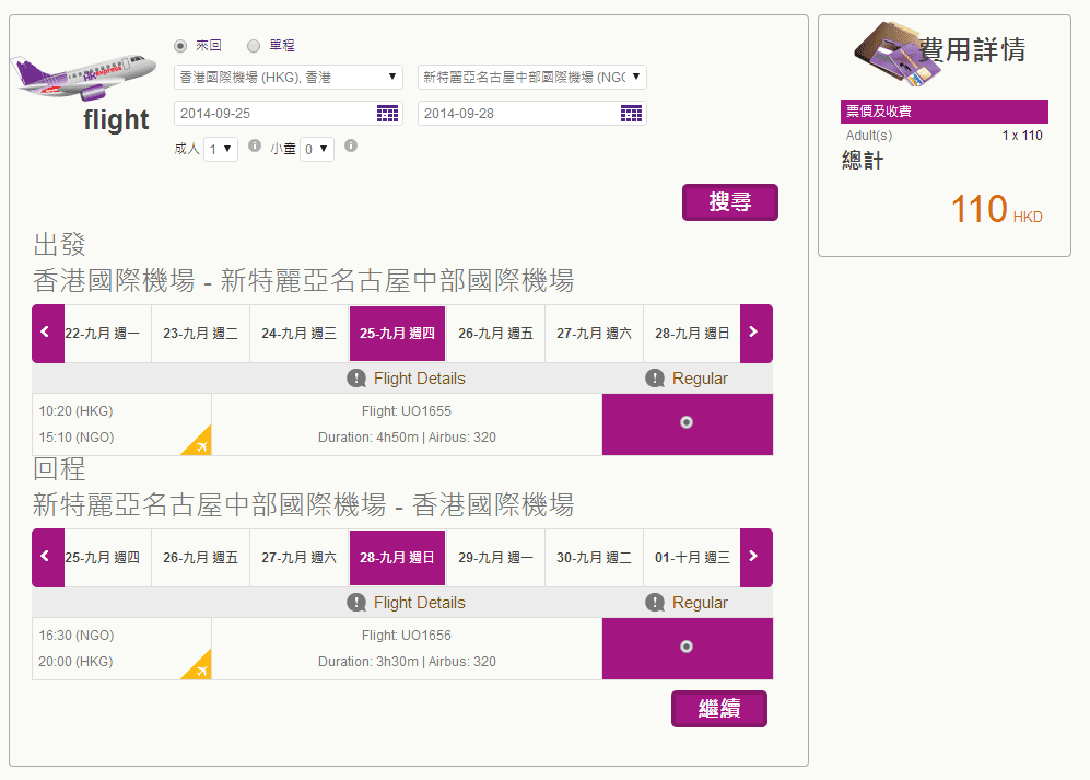 去程:UO1655 13:05-17:55 (一、五、六)、13:30-18:10 (二)、10:20-15:10 (四)、10:25-15:15 (日)