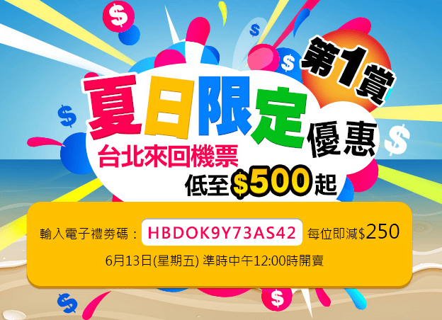 第1賞- 訂華航台北機票輸入指定電子禮券碼每單可以減$250,名額100個,手快有手慢無