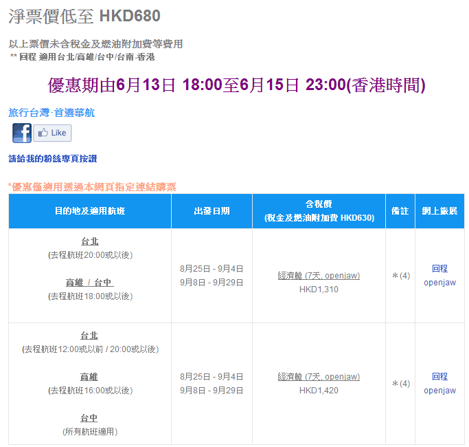 優惠可以open jaw,回程可以改由台北/高雄/台中/台南返香港