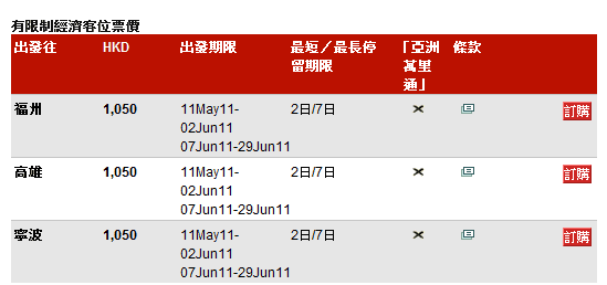 驚喜優惠只限三天,馬上訂購以上來回經濟客位機票, 於星期六(2011年5月7日)午夜前完成網上訂票程序!您亦可致電3193 2222購票。額滿即止,立即飛撲訂票!