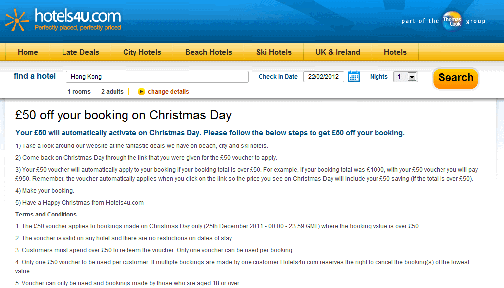 1. The £50 voucher applies to bookings made on Christmas Day only (25th December 2011 – 00:00 – 23:59 GMT) where the booking value is over £50.