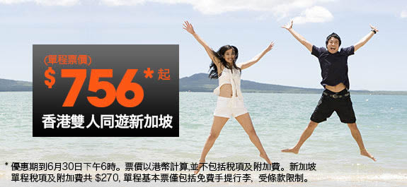 香港飛新加坡雙人單程只需$756起,來回連稅平均每人$1,309起