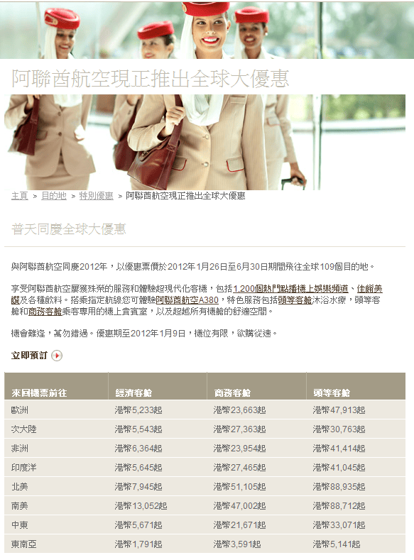 迎接2012 阿聯酋航空全球大優惠 (包含所有客艙及航線) 推介:曼谷$1,787(包稅) – 阿聯酋航空 Emirates (優惠至1月9日)
