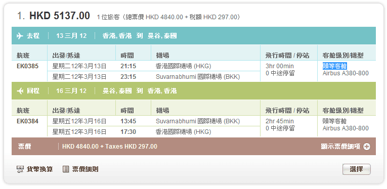 香港直航泰國曼谷頭等都係$5,137 (包稅),仲要A380