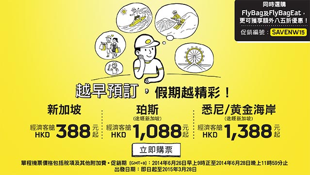 另外輸入促銷代碼 “SAVENW15“,回程時揀FLYBAG(包15kg行李)或FLYBAGEAT(包15kg行李同飛機餐)會有85折優惠
