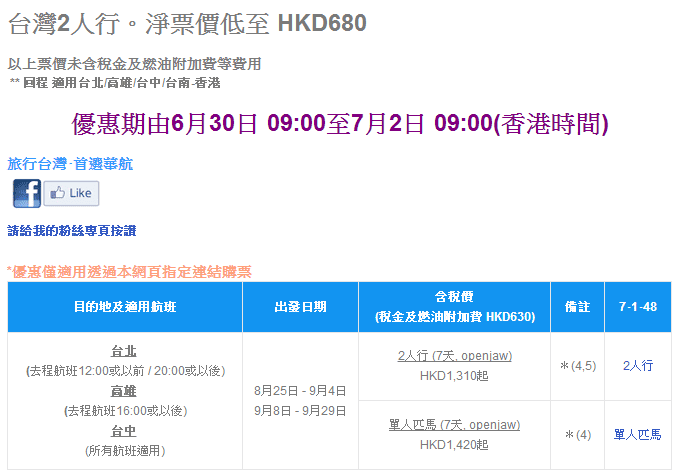 香港往返台北、高雄、台中二人同行每人只需$680,連稅$1,310