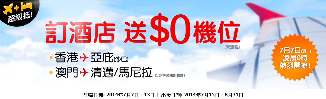 今晚12點(7月7日0:00am)AirAsiaGO又有訂酒店送$0機票優惠啦