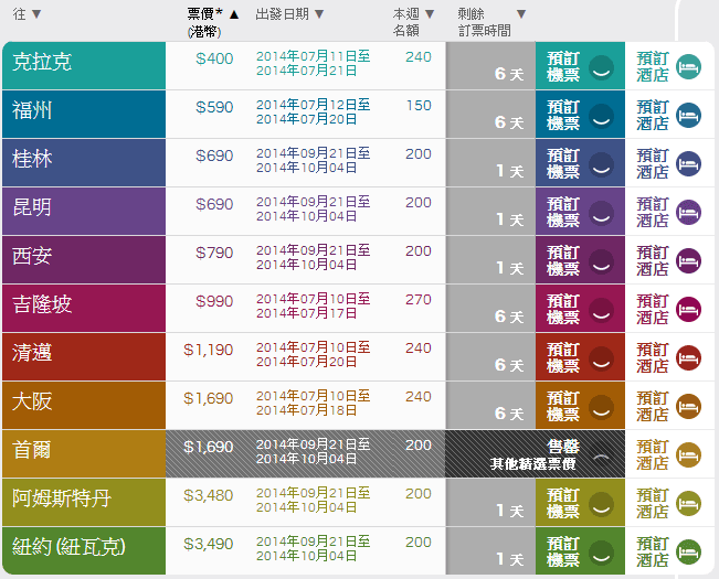 估計當中6個城市係9月下旬至10月頭出發,另外5個城市係黎緊兩星期內指定日子航班出發Last Minute優惠