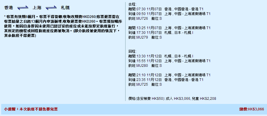 大家唔駛怕因delay而轉唔切機,因為上海飛札幌以早機出發為主,大家要早一日到上海隔夜中轉,而東航有免費中轉酒店提供