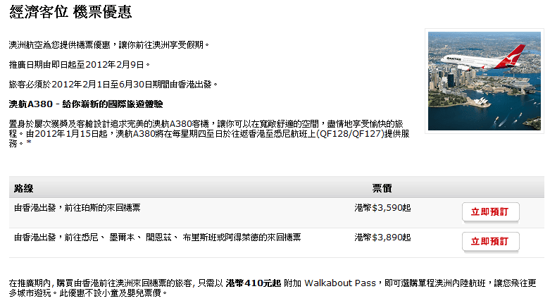 香港往返珀斯 $3,590 悉尼、 墨爾本、 開恩茲、 布里斯班或阿得萊德 $3,890 – 澳洲航空 Qantas Airways (至2012年2月9日)