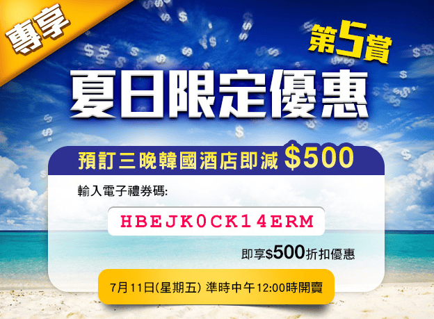 預訂3晚或以上韓國酒店並且滿$1,000,再輸入指定電子禮券碼就可以即減$500,名額有50個,手快有手慢無