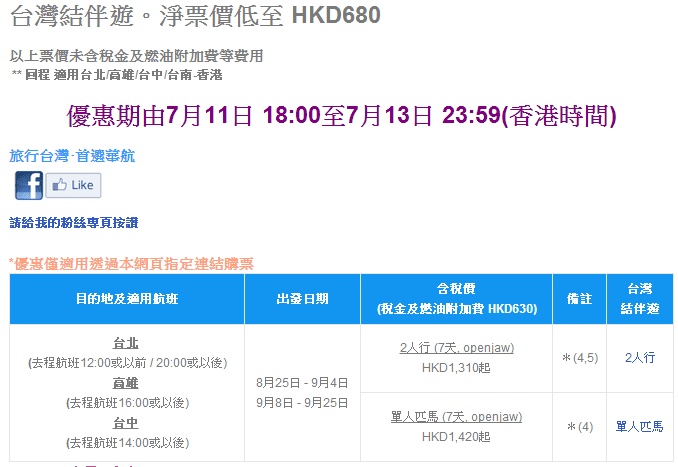 香港往返台北、高雄、台中二人同行每人只需$680,連稅$1,310