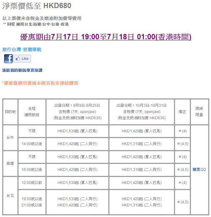 香港往返台北、高雄、台中二人同行每人只需$680,連稅$1,310