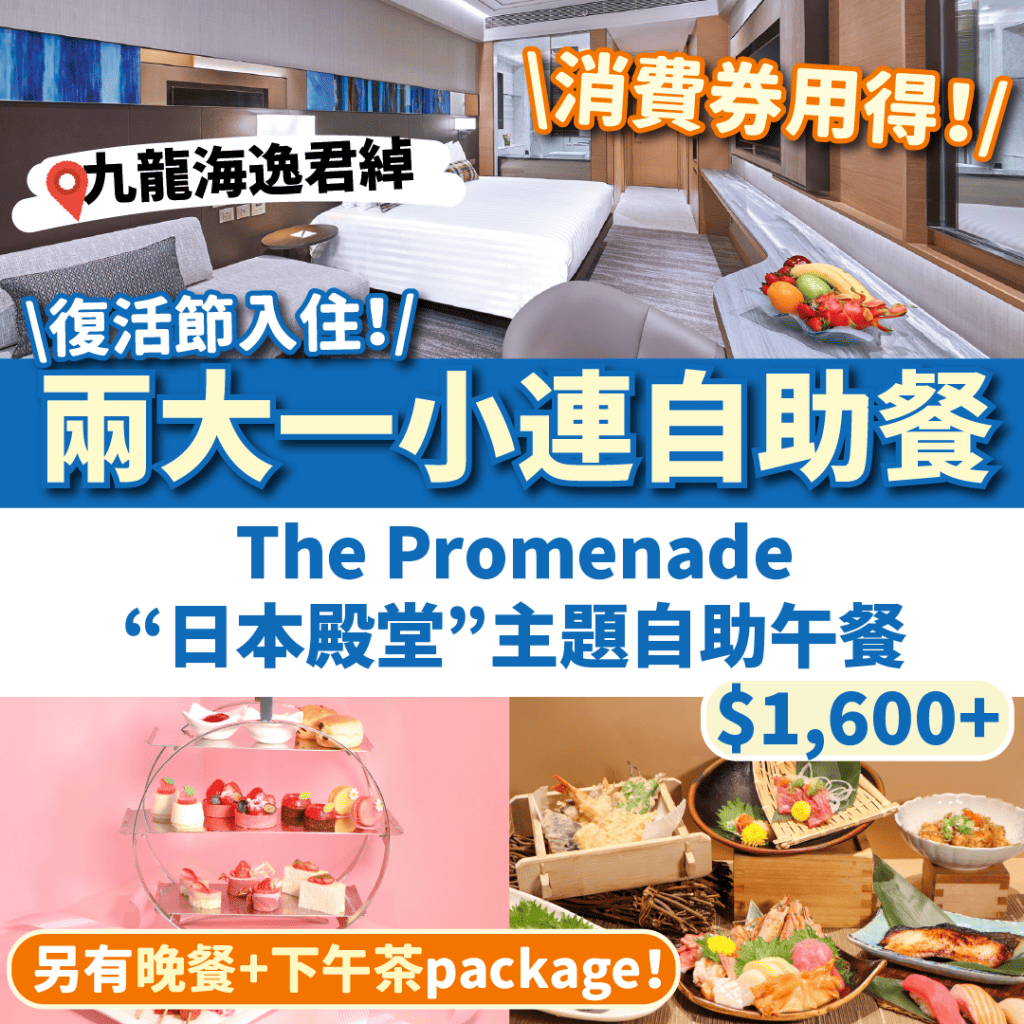 消費券出爐啦!唔知用喺邊?不妨復活節去staycation歎返晚!九龍海逸君綽酒店(Harbour Grand Kowloon)推出咗復活節限定優惠!兩大一小(11歲以下)入住連The Promenade全新”日本殿堂”主題自助午餐,一晚$1,600起!”日本殿堂”主題自助餐有一系列日本料理,好似和牛壽司、北海道帶子刺身、蒲燒鰻魚、黑松露醬炒北海道帶子、日式磯煮鮑魚、西京燒銀鱈魚、抹茶朱古力噴泉等,等大家可以嚟一趟日本「滋」旅!