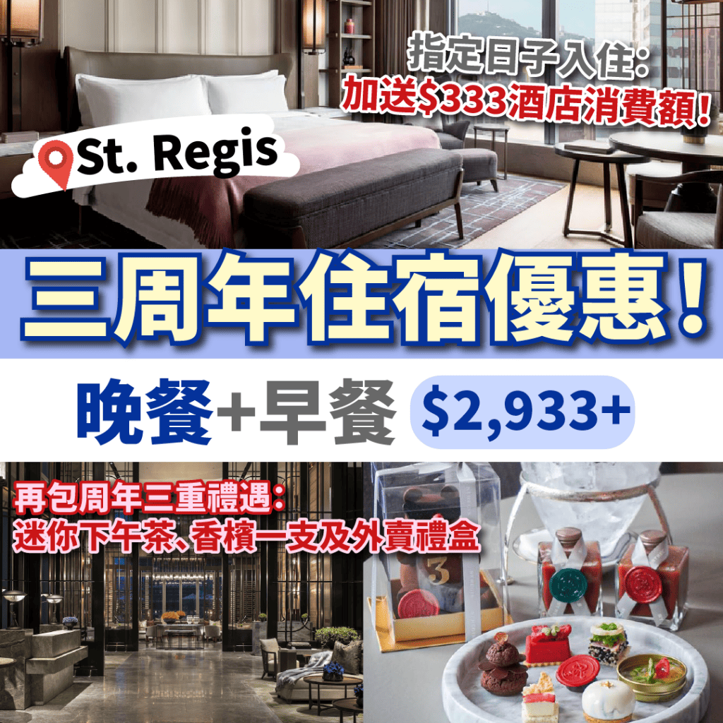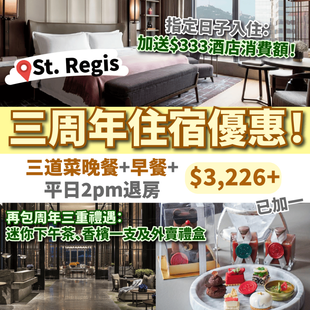 香港瑞吉酒店(The St. Regis Hong Kong) 三周年嘅優惠繼續有!三道菜晚餐+早餐+三周年禮遇(迷你下午茶+香檳+外賣禮盒)+平日2pm退房,一晚連服務費$3,226起!外賣禮盒有2支酒店特創cocktail-Canto Mary+周年熊!另外4月30日前入住再送$333酒店消費額!
