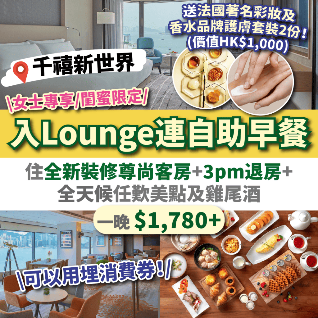 嘩!千禧新世界香港酒店(New World Millennium Hong Kong Hotel)同法國著名護膚、彩妝及香水品牌GUERLAIN聯乘推出staycation優惠!專為女士而設!入住全新裝修尊尚客房連聚賢薈貴賓廊禮遇(享用全天候供應美點及雞尾酒時段)+自助早餐,一晚$1,780起!並享每房兩份法國GUERLAIN獨家禮品套裝(總價值HK$1,000)+3pm退房!仲包房內迷你酒吧非酒精飲品!全新裝修尊尚客房以淺木+大地色做主調,大大個落地玻璃!勁chill!呢個優惠復活節假期都用得,仲可以用埋消費券~快啲Book嚟歎返晚啦!