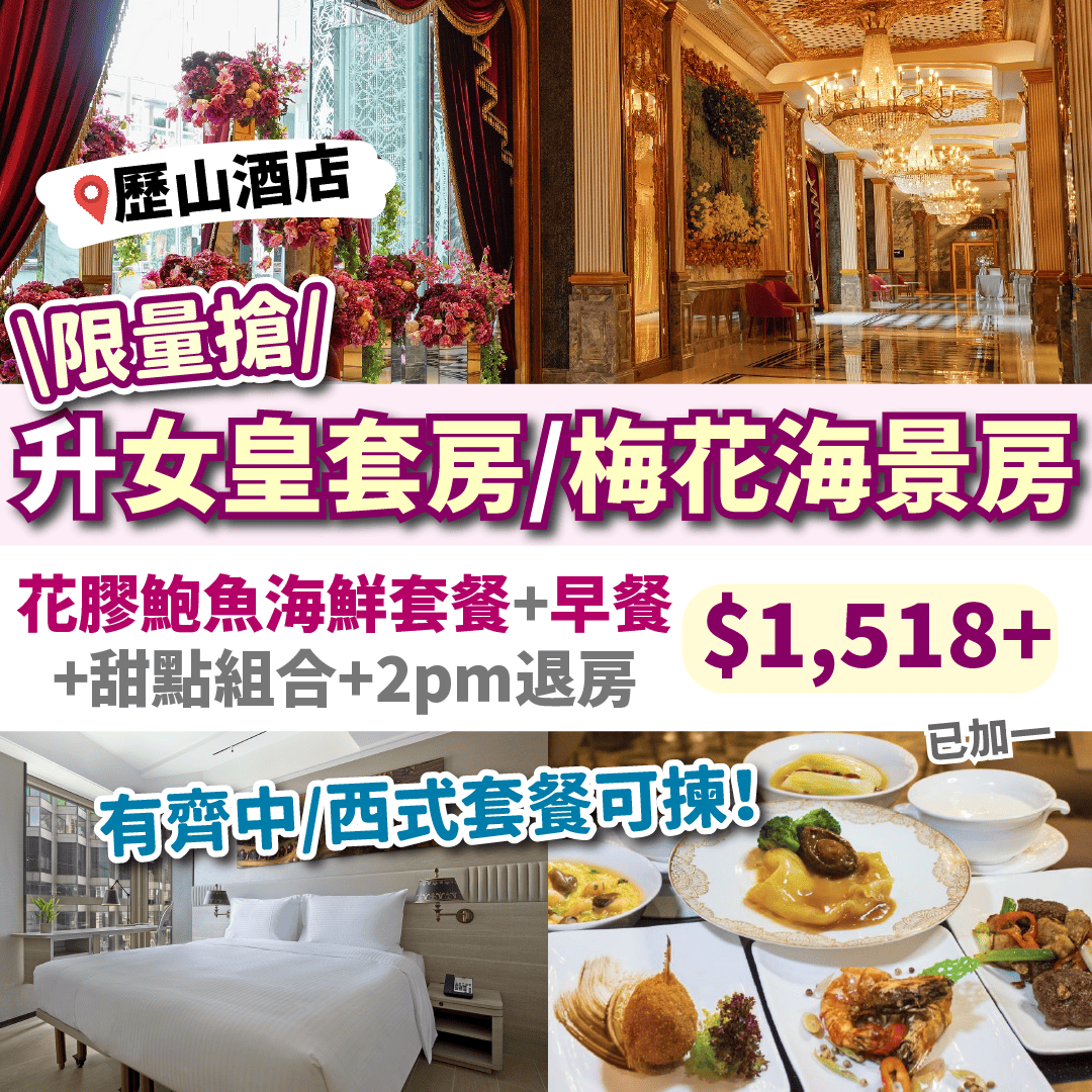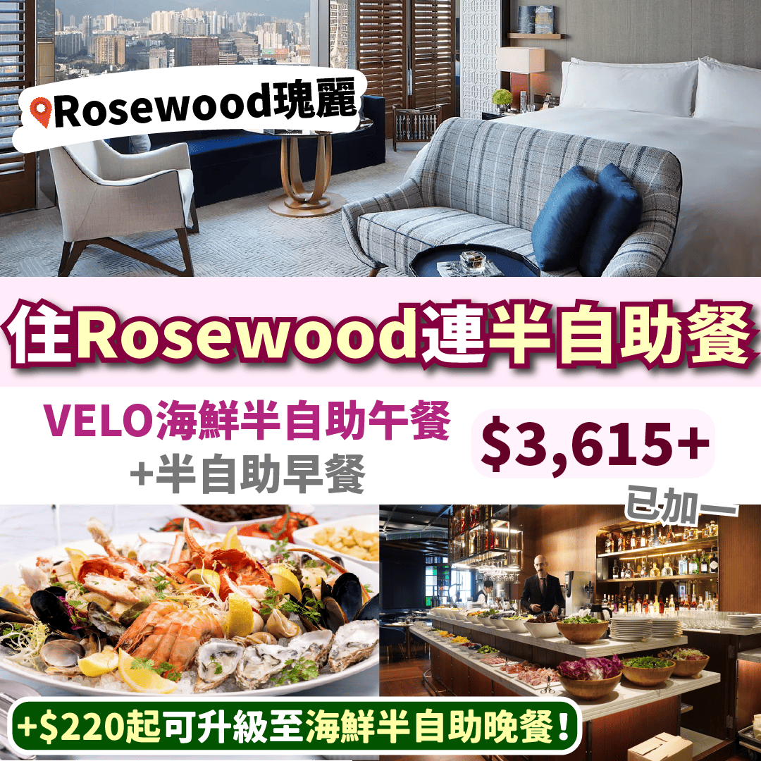 香港瑰麗酒店(Rosewood Hong Kong)今晚9pm有兩餐半自助餐優惠!入住連VELO海鮮半自助午餐+半自助早餐,一晚連服務費$3,615起!+$220起可升級至海鮮半自助晚餐!半自助午餐可以8選1,有M4和牛扒、香烤豬鞍、Margherita Pizza等選擇!自助餐方面就有沙律吧、海鮮、烤肉同甜品等任食!另有如果加$轉半自助晚餐,就要留意返平日同週末嘅主菜都唔同㗎!
