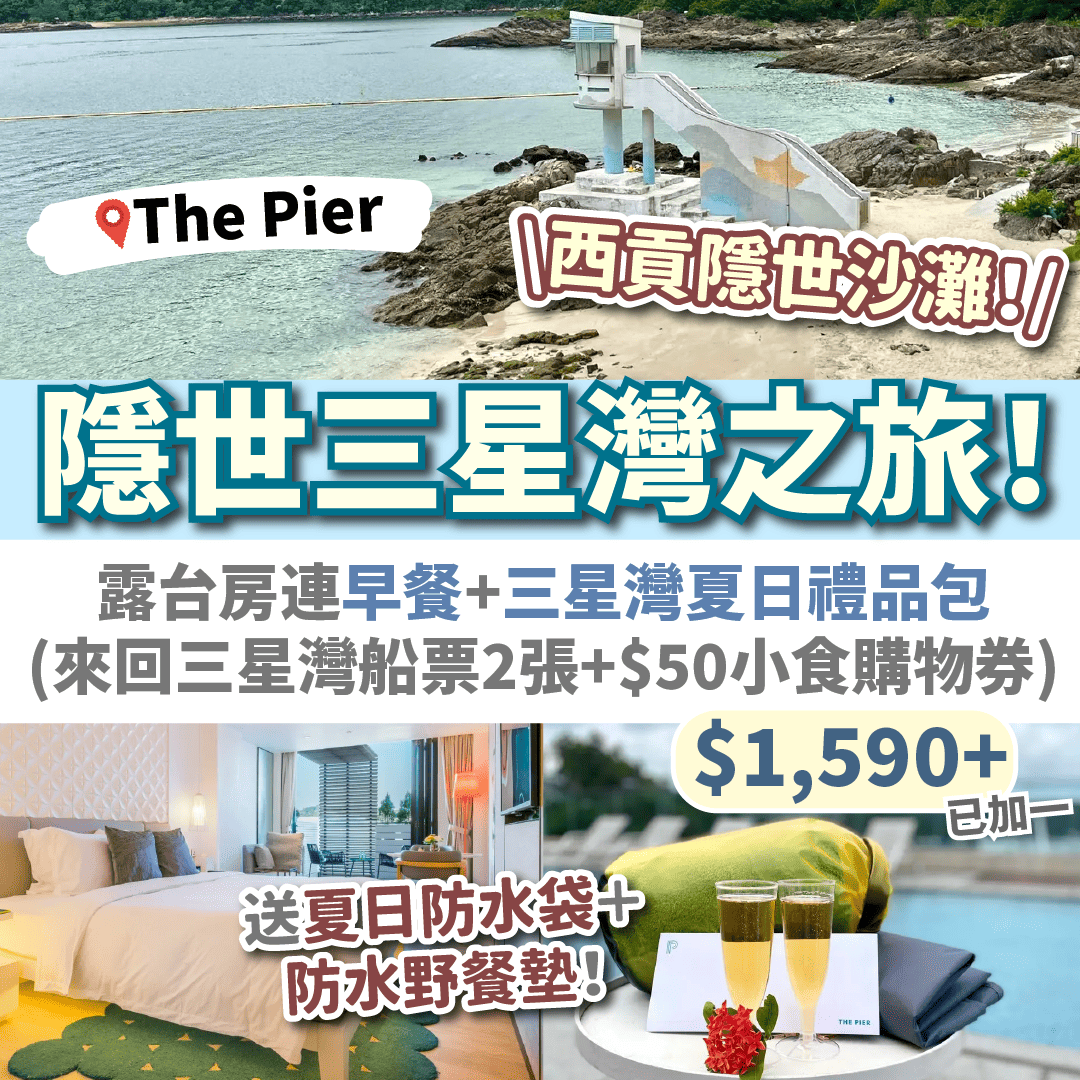 夏日熱辣辣!藍天白雲最好就係去戶外打卡!今晚9pm The Pier Hotel西貢隱世沙灘-三星灣staycation優惠!露台房連早餐+三星灣夏日禮品包(來回三星灣船票2張+$50小食亭購物券),一晚連服務費$1,590起!禮品包除咗有船票同小食亭券外,仲包埋防水袋+防水野餐墊!三星灣因為冇車直達,所以一向人煙稀少~今次Package包埋船票,係機會去朝聖一下!返到酒店上埋天台仲有西貢白沙灣可以打卡!真係影相都影到手軟呀!