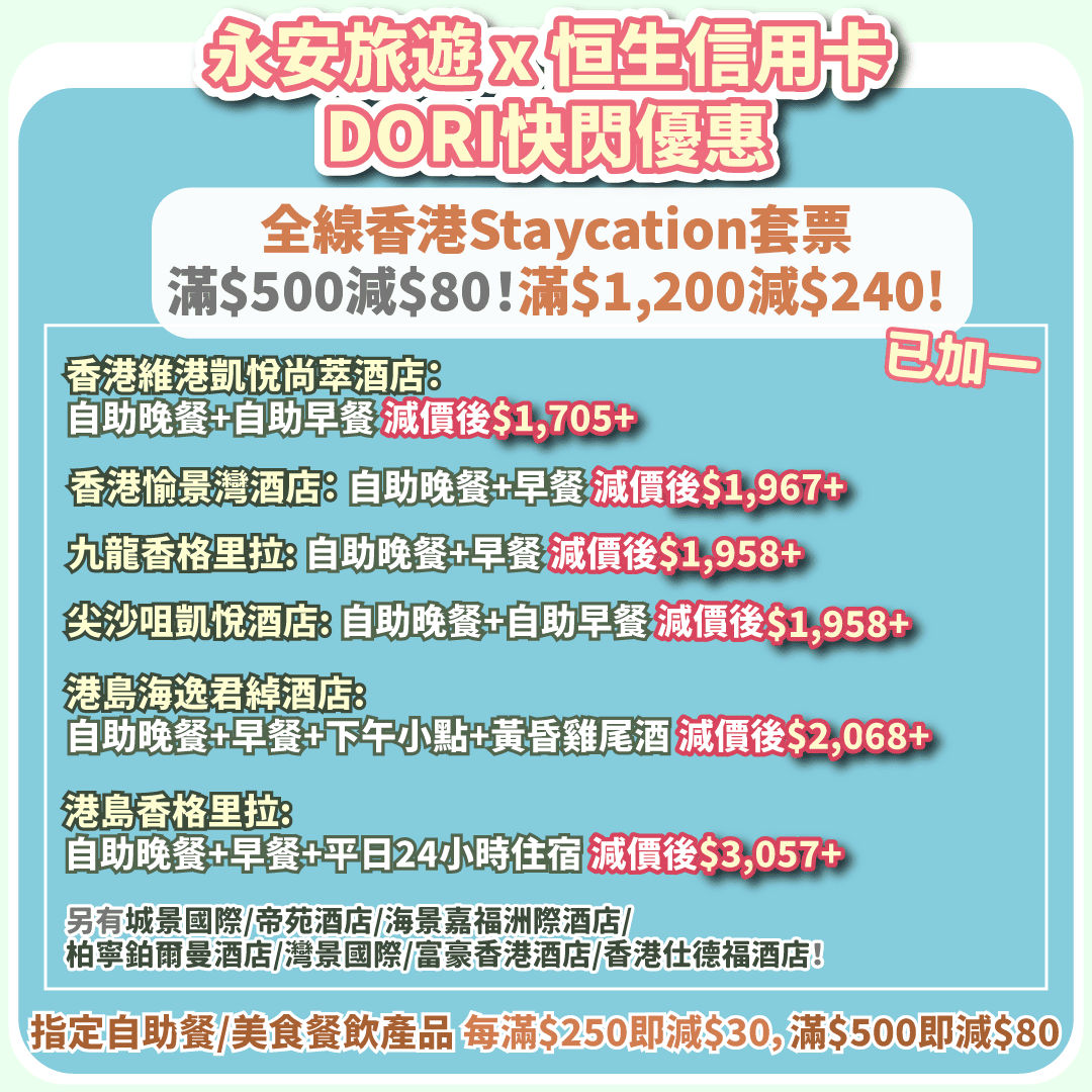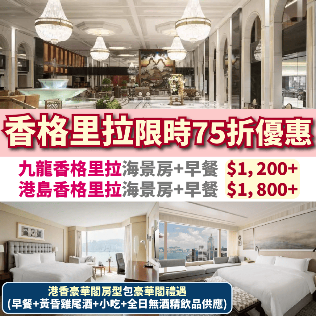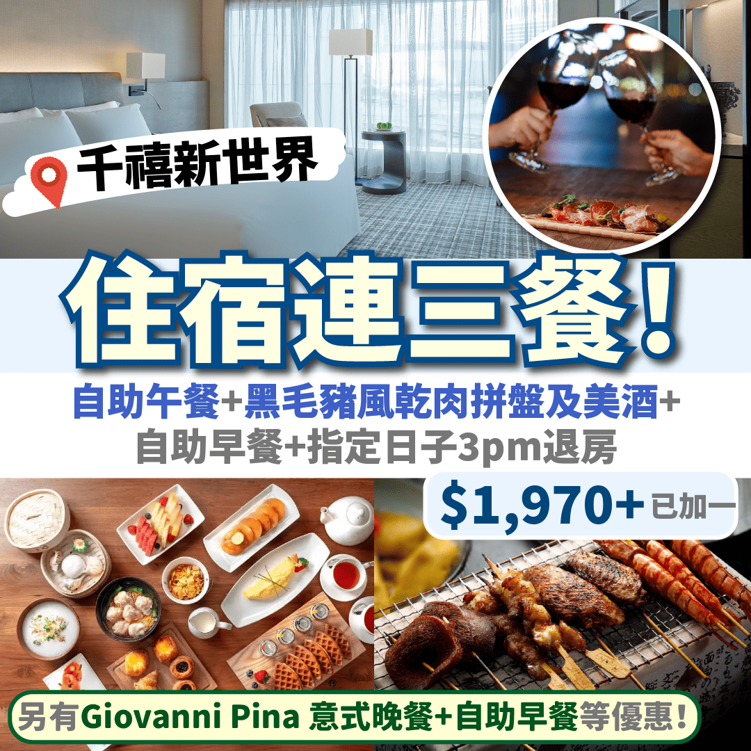 千禧新世界香港酒店(New World Millennium Hong Kong Hotel)住宿連自助午餐+自助早餐+黑毛豬風乾肉拼盤連美酒,一晚連服務費$1,970起!自助午餐菜式都幾豐富~有鐵板燒牛扒/三文魚、雜錦天婦羅、海南雞飯等!+$250起更可升級歎自助晚餐!8-9月會係「東南亞美食巡禮」!鍾意東南亞美食嘅就唔好錯過啦!另有Giovanni Pina 意式晚餐+早餐等優惠!