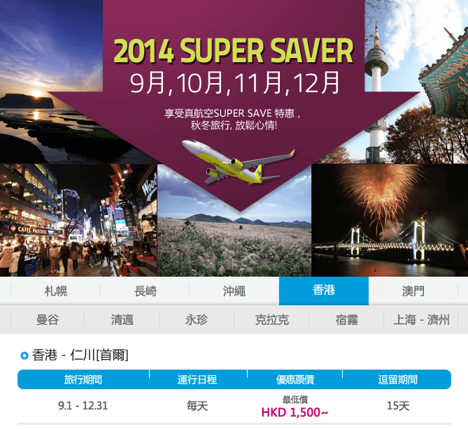真航空推出左9月至12月飛首爾優惠