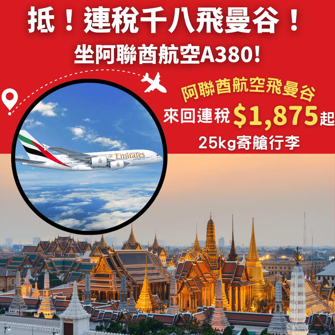 抵呀!連稅千八蚊!坐阿聯酋航空A380飛曼谷!25kg寄艙行李!香港飛曼谷來回連稅只需$1,875起 – 阿聯酋航空 (優惠至1月29日)