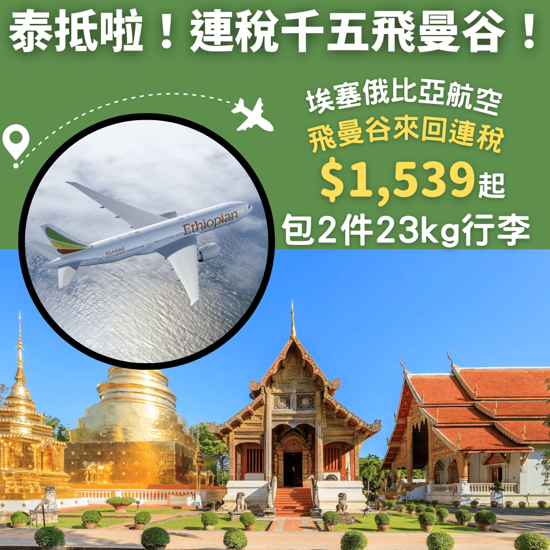 抵呀!連稅千五飛曼谷!包2件23kg行李!香港飛曼谷來回連稅只需$1,539起 – 埃塞俄比亞航空