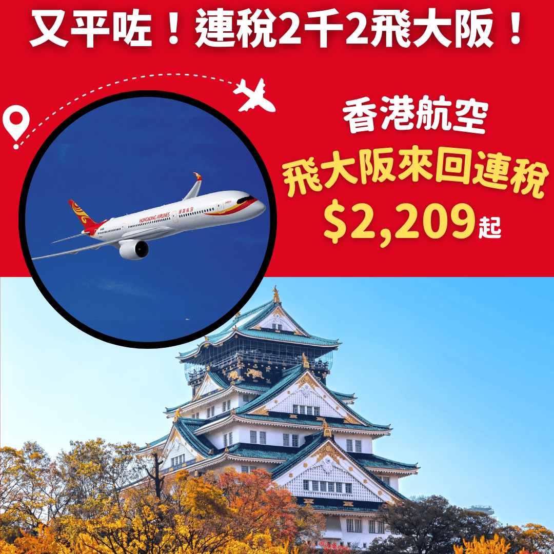 又平咗!連稅2千2飛大阪!3月22日前出發!香港飛大阪來回連稅只需$2,209起 – 香港航空 (優惠至1月31日)