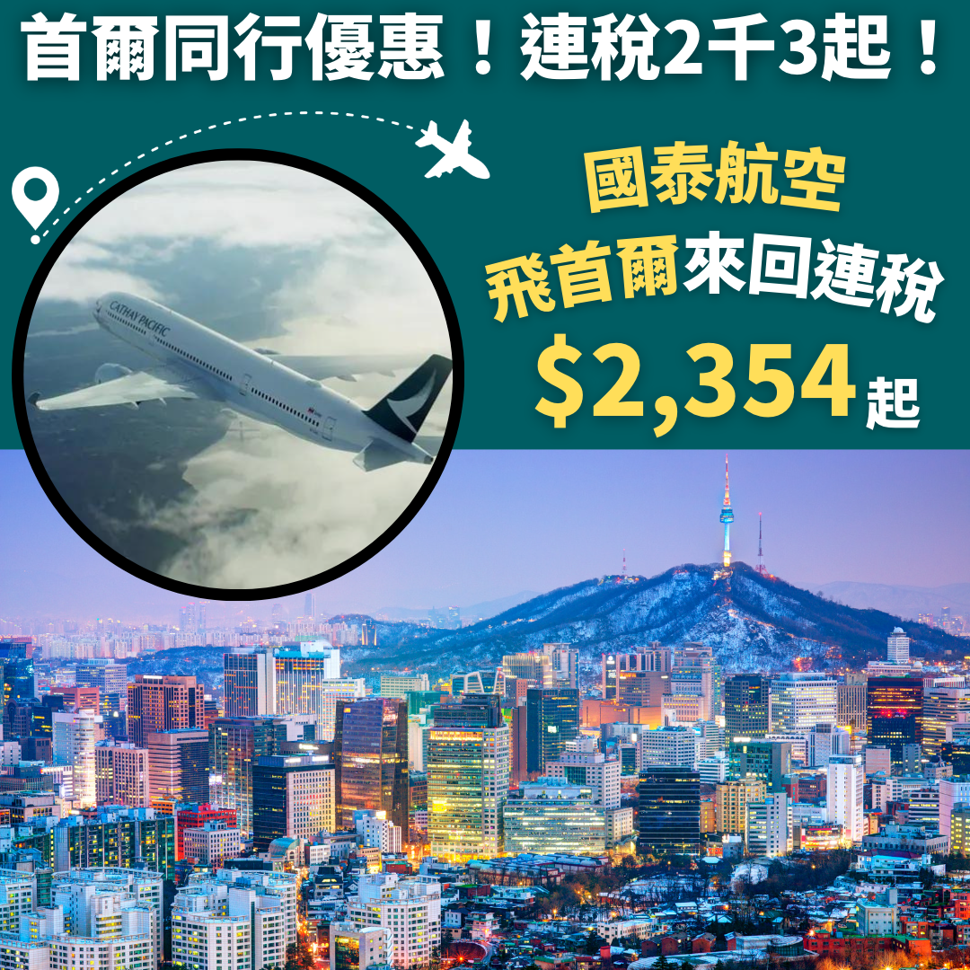 連稅2千3起!國泰首爾同行優惠!6月30日前出發!香港飛首爾二人/四人同行來回連稅每人$2,354起 – 國泰航空 (優惠至2月28日)