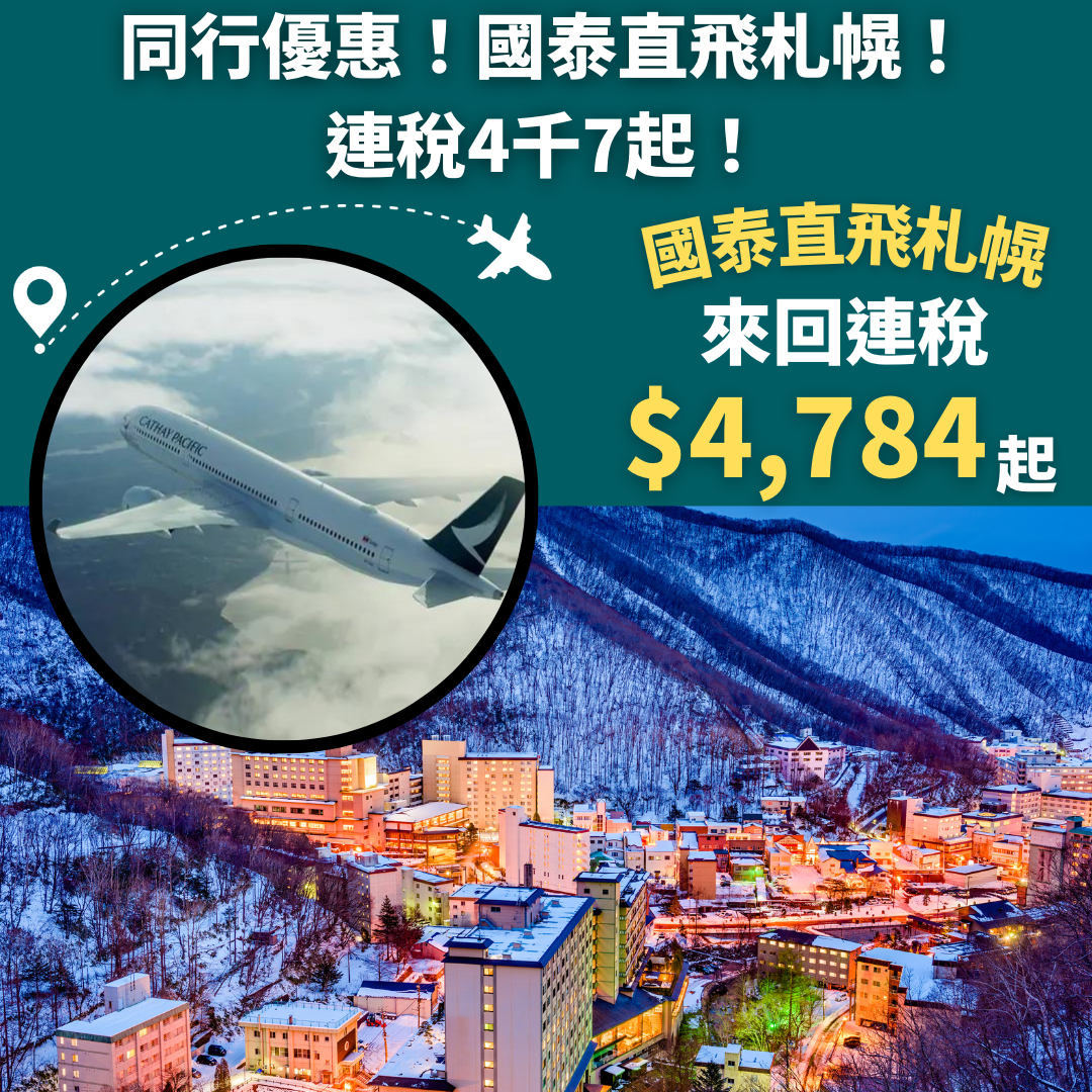 連稅4千7起!國泰直飛札幌同行優惠!6月30日前出發!香港飛札幌二人/四人同行來回連稅每人$4,784起 – 國泰航空 (優惠至2月28日)