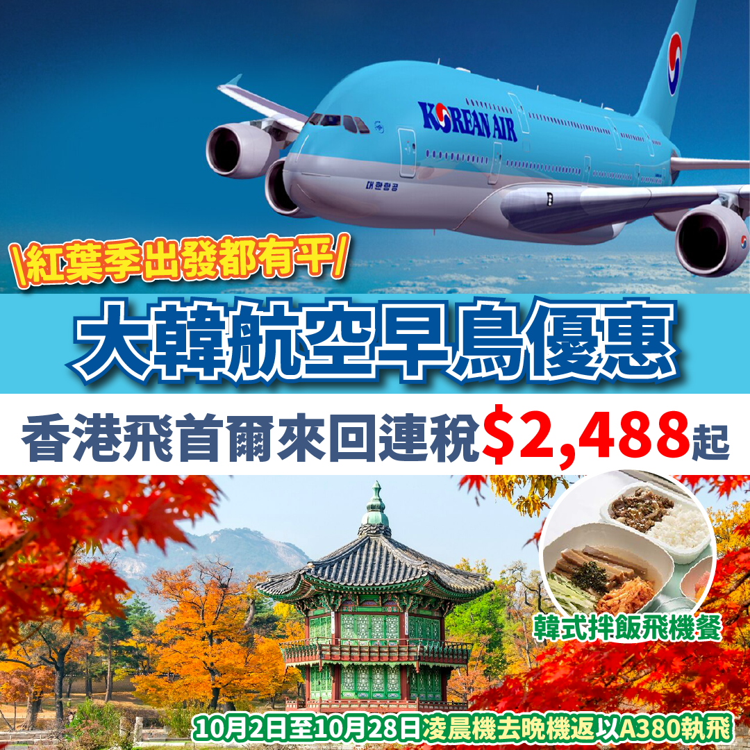 抵呀!大韓官網早鳥優惠!紅葉季出發都有平!23kg行李!香港飛首爾來回連稅只需$2,488起 – 大韓航空 (優惠至8月31日)