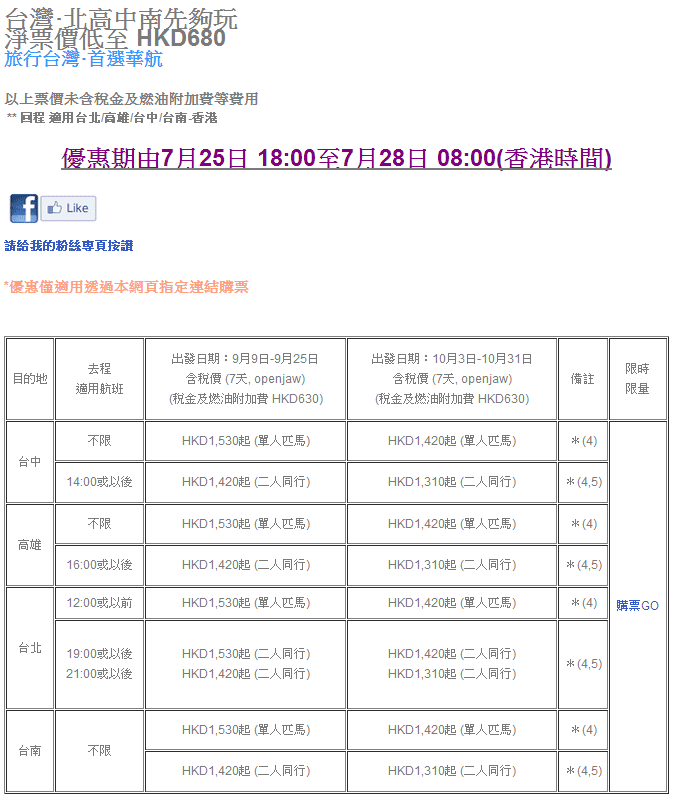 香港往返台北、高雄、台中、台南二人同行每人只需$646,連稅$1,276