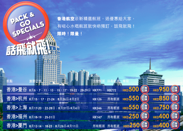 香港航空除左有”一click即享”優惠外(詳情:https://www.meethk.com/?p=20384),仲會有”話飛就飛”8月同9月出發優惠