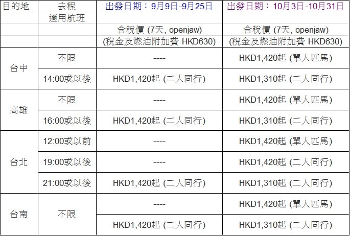 再度推出!9月至10月出發!香港往返台北、高雄、台中、台南二人同行每人只需$646起 (可open jaw) – 中華航空 (優惠至7月31日)