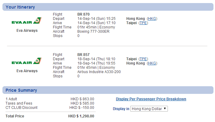 用左折扣代碼減$150後,香港往返台北只需$713,連稅$1,298,價錢唔錯