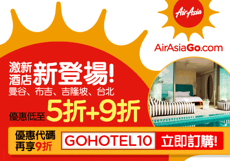 台北、曼谷、布吉、吉隆坡新酒店高達五折優惠!可配合10%折扣優惠代碼再減 – AirAsiaGO (優惠至8月10日)