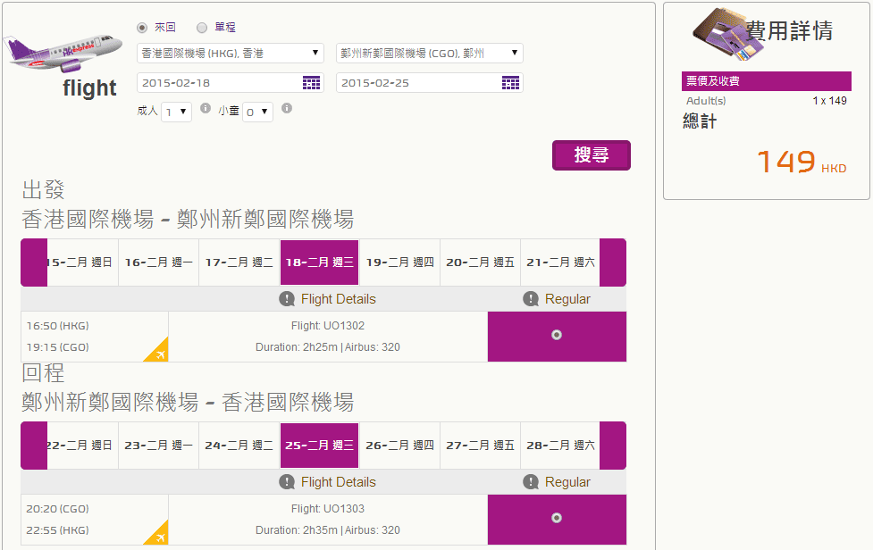 去程:UO1302 16:50-19:15 (三、五)
