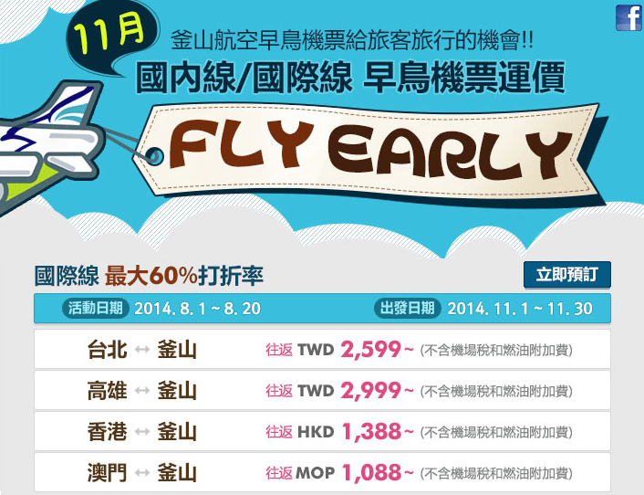 澳門出發都有優惠,澳門飛釜山來回MOP1,088,連稅MOP2,082