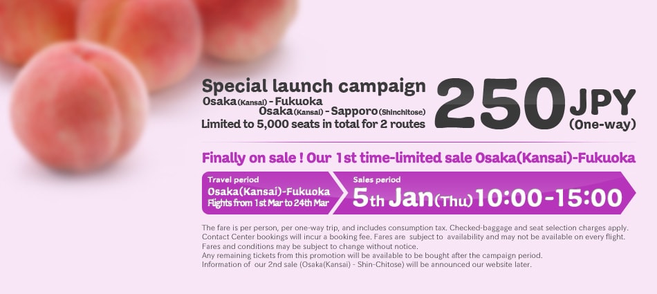 桃子航空終於公佈開售時間了,會係日本時間今天(1月5日) 10am – 3pm (香港時間9am – 2pm) 開售