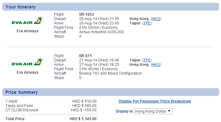 用左折扣代碼減$150後,香港往返台北只需$760,連稅$1,345,暑假旺季黎講好抵了