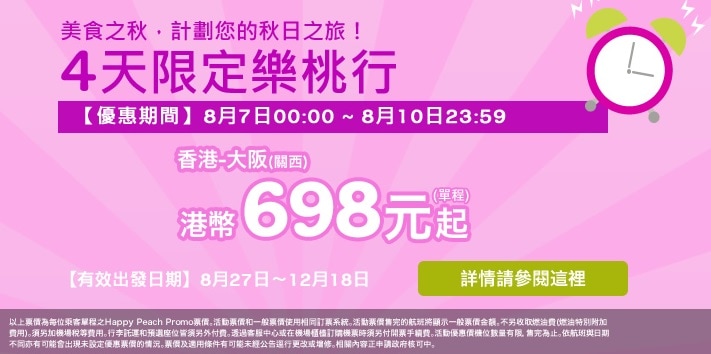 今晚12點(8月7日0:00am)廉航樂桃會再次推出香港飛大阪優惠
