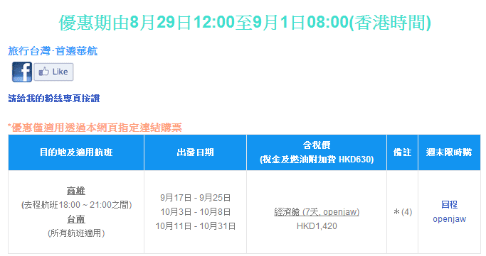 華航今個周末繼續有限時優惠,不過今次得返高雄同台南有優惠,一人成行