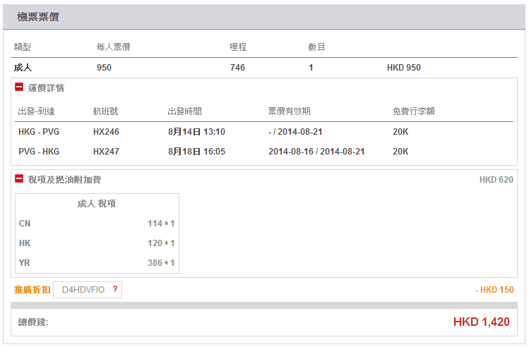 香港往返上海浦東$950,周末熱價減$150,只需$800,連稅$1,420